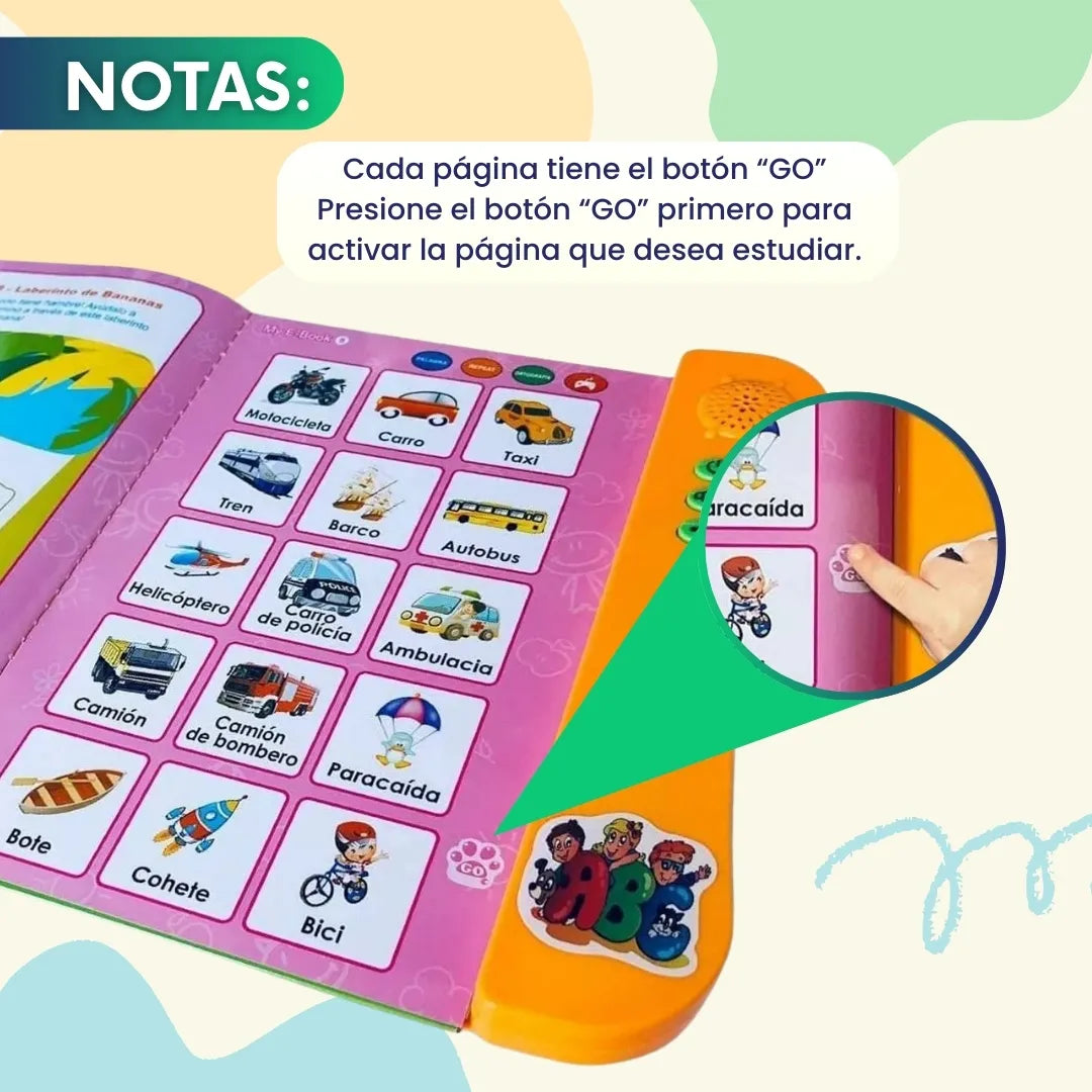 Nuestro libro didáctico con sonido hace que aprender sea una experiencia sensorial con voces, efectos y música que captan su atención al instante.