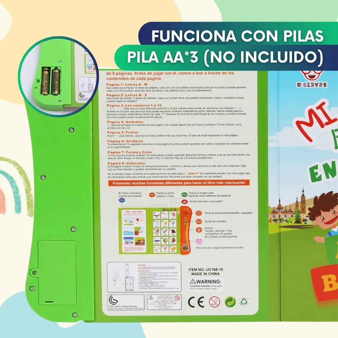 Nuestro libro didáctico funciona con pilas AA NO incluidas, para que tu hijo comience a aprender y jugar de inmediato.