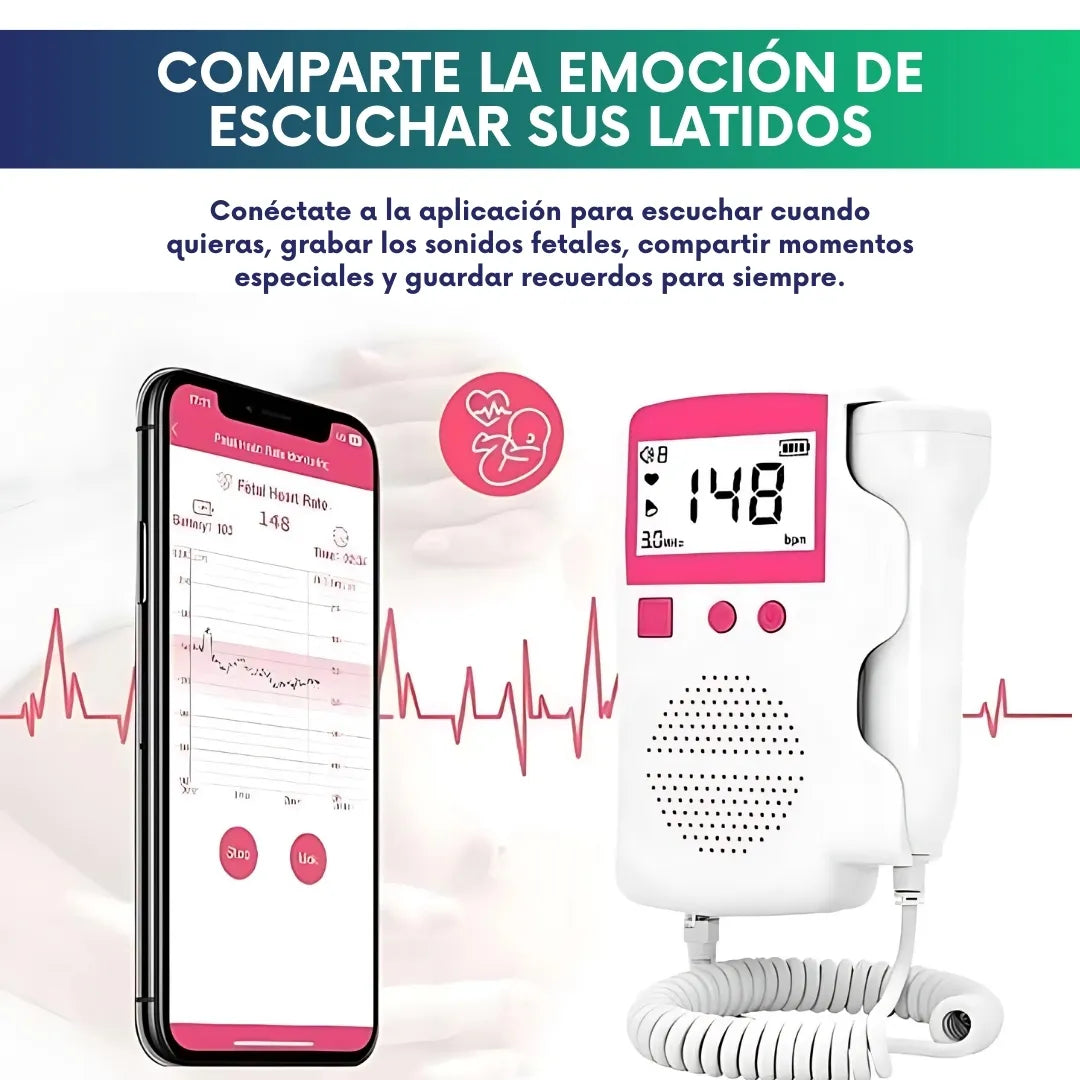 Su sonda de 2.5 MHz capta los latidos del bebé con total claridad desde las primeras semanas. Sin interferencias, sin ruido